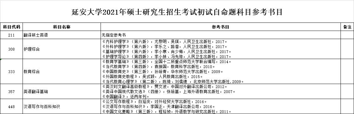 点击查看:延安拼搏(中国)2021年硕士研究生招生考试初试自命题科目参考书目.xlsx