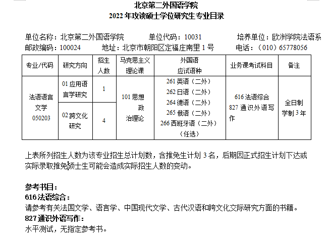 北京第二外国语学院2022年硕士研究生考试招生自命题科目参考书目
