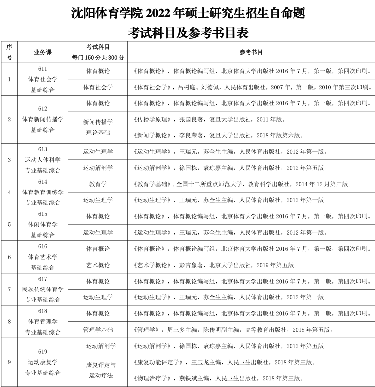 沈阳体育学院2022年硕士研究生招生自命题考试科目及参考书目表