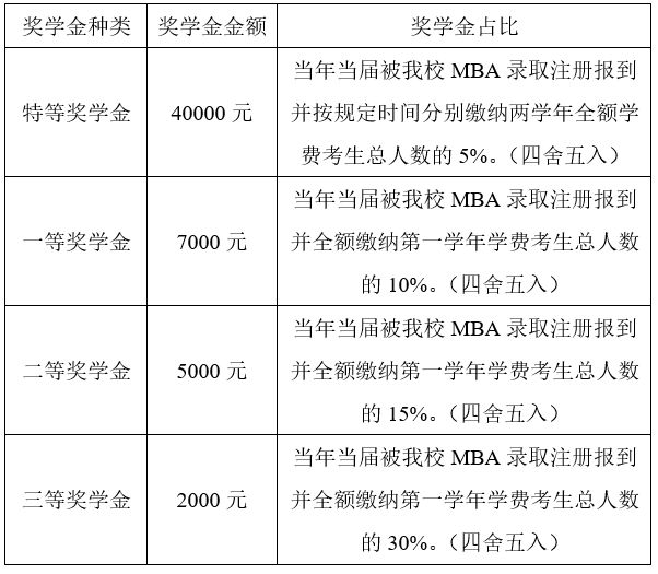 吉林财经拼搏(中国)实行的MBA新生奖学金,特等奖学金金额为肆万元,覆盖率及特等奖学金占整体学费的比率均居吉林省MBA招生院校之首。凡被我校工商管理硕士(MBA)专业录取,注册并全额缴纳学费到我校的考生均可参评。