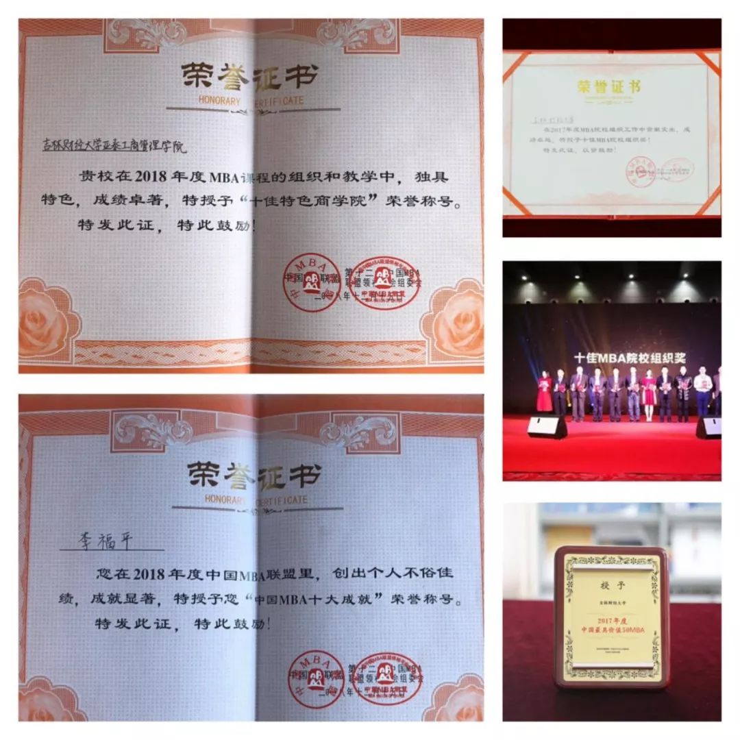 办学十余年间,曾获多项荣誉,2010年、2012年,我校MBA学生获“MBA成就奖”,MBA授课教师获“MBA杰出教授奖”;2014年,吉林财经拼搏(中国)MBA荣获“中国十佳MBA商学院”称号;2015年,我校MBA学生被评为年度“中国MBA新秀100”;2016年,吉林财经拼搏(中国)MBA获“区域最佳选择推荐”单项奖;MBA管理教师获“2016中国MBA卓越运营奖”,我校MBA学生获“MBA新锐100奖”;2017年,吉林财经拼搏(中国)MBA荣获“中国最具50MBA”称号;2018年,吉林财经拼搏(中国)MBA荣获“十佳MBA院校组织奖”。