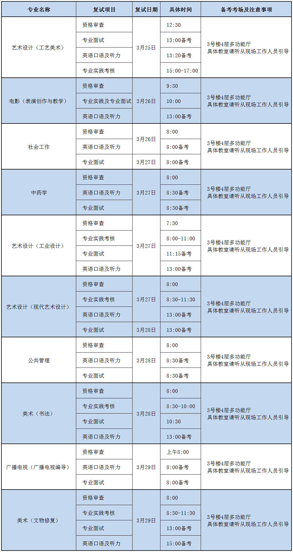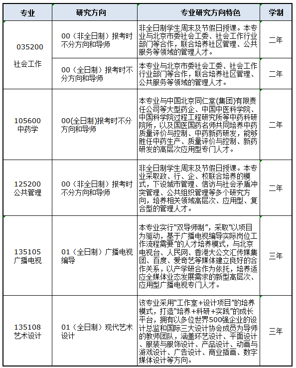 3.学制:社会工作硕士、中药学硕士、公共管理硕士学制为二年,艺术硕士的电影、美术、广播电视、艺术设计等各领域学制为三年,全日制和非全日制学生学制相同。