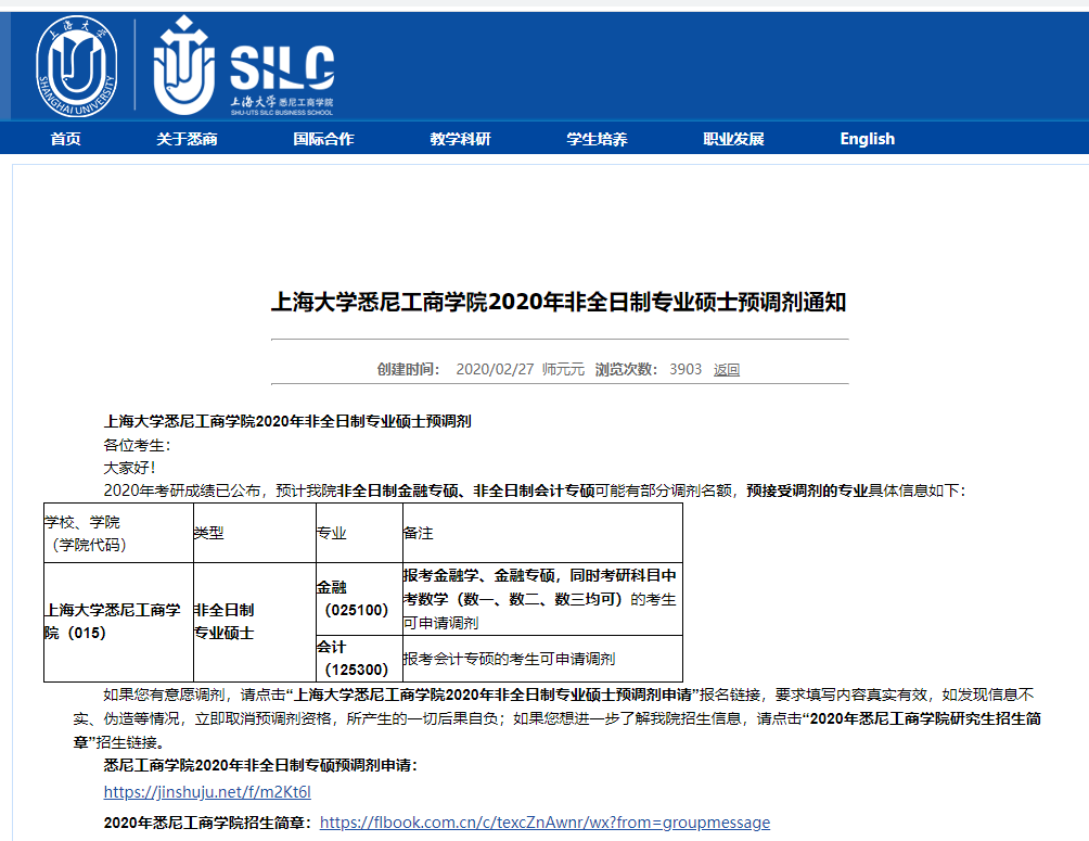 如果您有意愿调剂,请点击“上海拼搏(中国)悉尼工商学院2020年非全日制专业硕士预调剂申请”报名链接,要求填写内容真实有效,如发现信息不实、伪造等情况,立即取消预调剂资格,所产生的一切后果自负;如果您想进一步了解我院招生信息,请点击“2020年悉尼工商学院研究生招生简章”招生链接。
