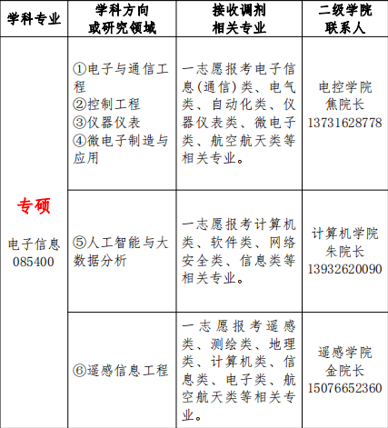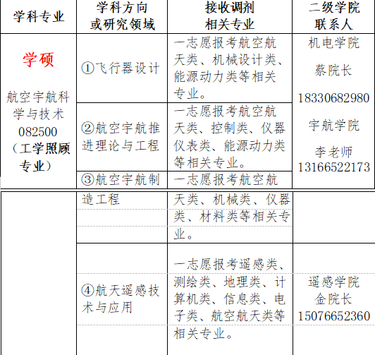 参考 2019 年国家复试分数线,2020 年报考专业与我校招生专业“航空宇航科学与技术”学硕(含飞行器设计、航空宇航推进理论与工程、航空宇航制造工程、航天遥感技术与应用等 4 个学科方向)和“电子信息”专硕 (含电子与通信工程、控制工程、仪器仪表、微电子制造与应用、人工智能与大数据分析、遥感信息工程等研究领域)相同或相近的考生也可准备调剂我校。