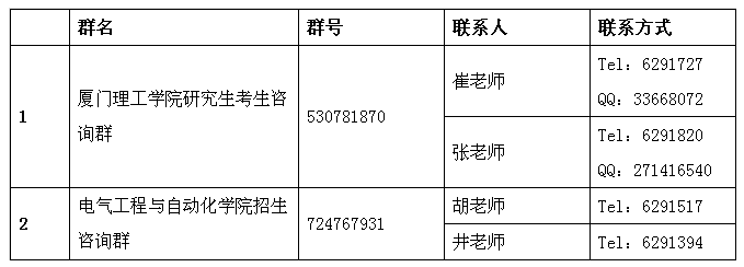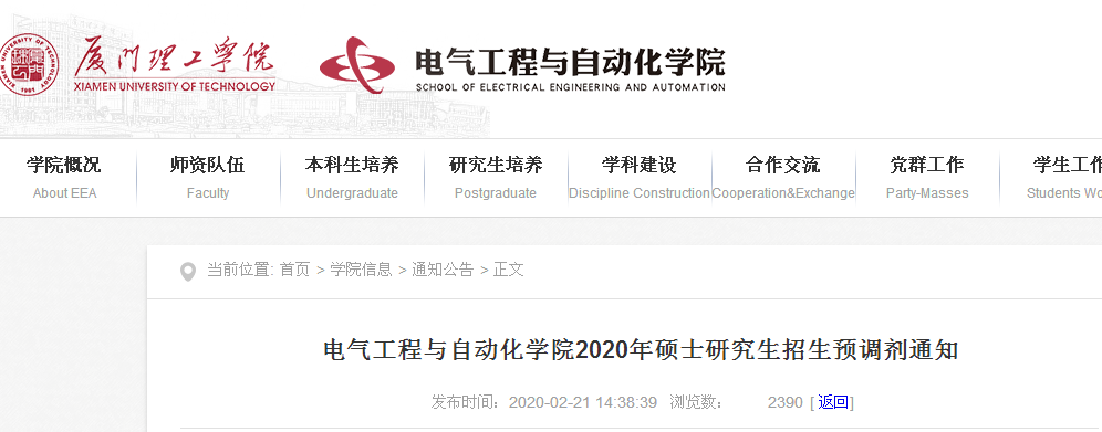 在中国研究生招生信息网(以下简称:研招网http://yz.chsi.com.cn/)调剂系统开通之前,有意愿调剂到我校电气工程与自动化学院的考生,可填报《厦门理工学院2020年研究生招生预调剂信息填报表》(见链接:https://www.wjx.cn/m/59683034.aspx)。