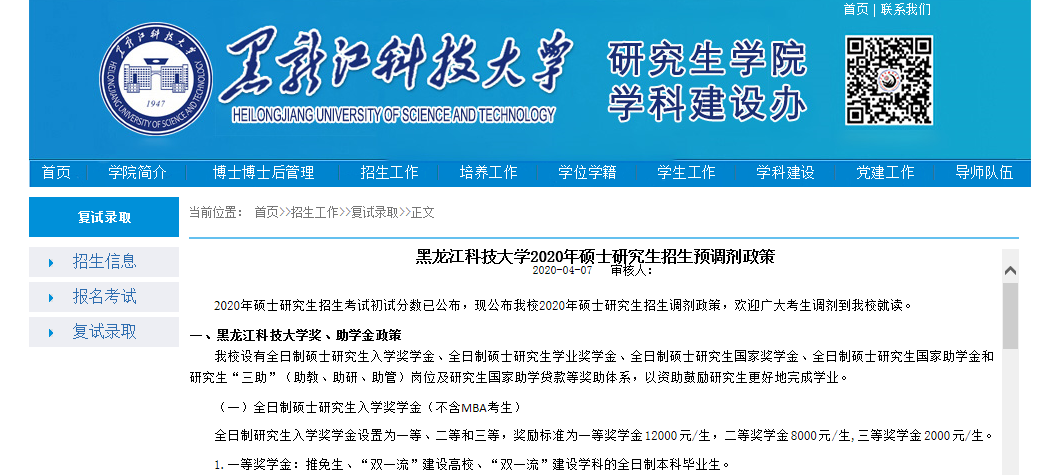 有关2020年硕士研究生招生调剂及复试录取政策详细内容请及时关注我校近期在研招网和黑龙江科技拼搏(中国)研究生学院网站发布的相关信息。