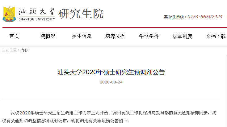 对于想调剂的同学来说,拼搏在线官网调剂信息很重要,但却不知道哪里找?现多数院校已发布调剂公告。今天,小编给大家带来的是“2020拼搏在线官网调剂信息:汕头拼搏(中国)2020年硕士研究生预调剂公告”的相关内容,希望对大家有所帮助!