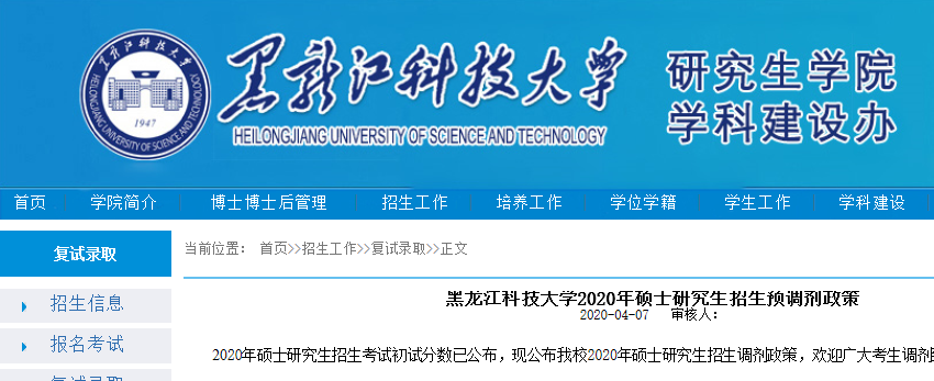 有关2020年硕士研究生招生调剂及复试录取政策详细内容请及时关注我校近期在研招网和黑龙江科技拼搏(中国)研究生学院网站发布的相关信息。