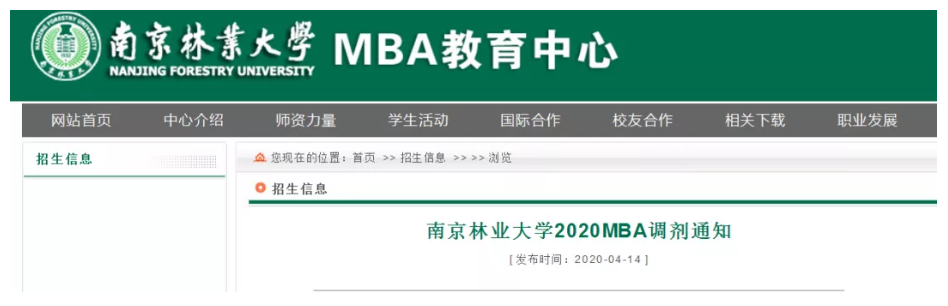根据南京林业拼搏(中国)学科建设与学位点发展的需要,我校工商管理硕士(MBA)专业目前还有部分调剂名额,接收2020年校外调剂考生,请有意向调剂到南京林业拼搏(中国)攻读MBA学位的考生按照以下要求办理调剂事宜。