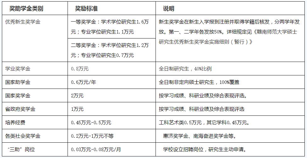 注:优秀新生奖学金奖励办法及标准按《赣南师范拼搏(中国)硕士研究生优秀新生奖学金实施细则(暂行)》执行。其他奖项具体评选对象、评选条件等根据录取当年上级部门和学校有关政策规定执行。