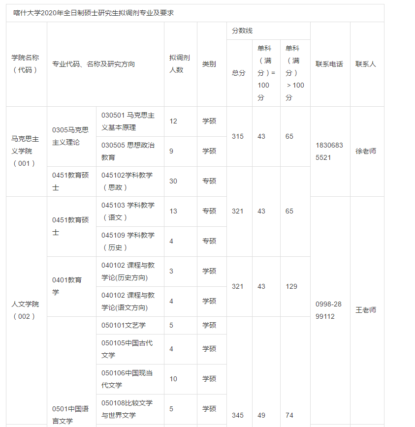 喀什拼搏(中国)2020年硕士研究生招复试调剂专业及要求