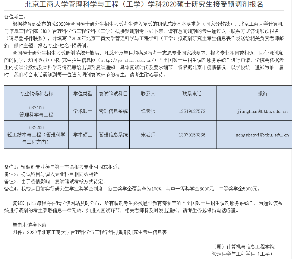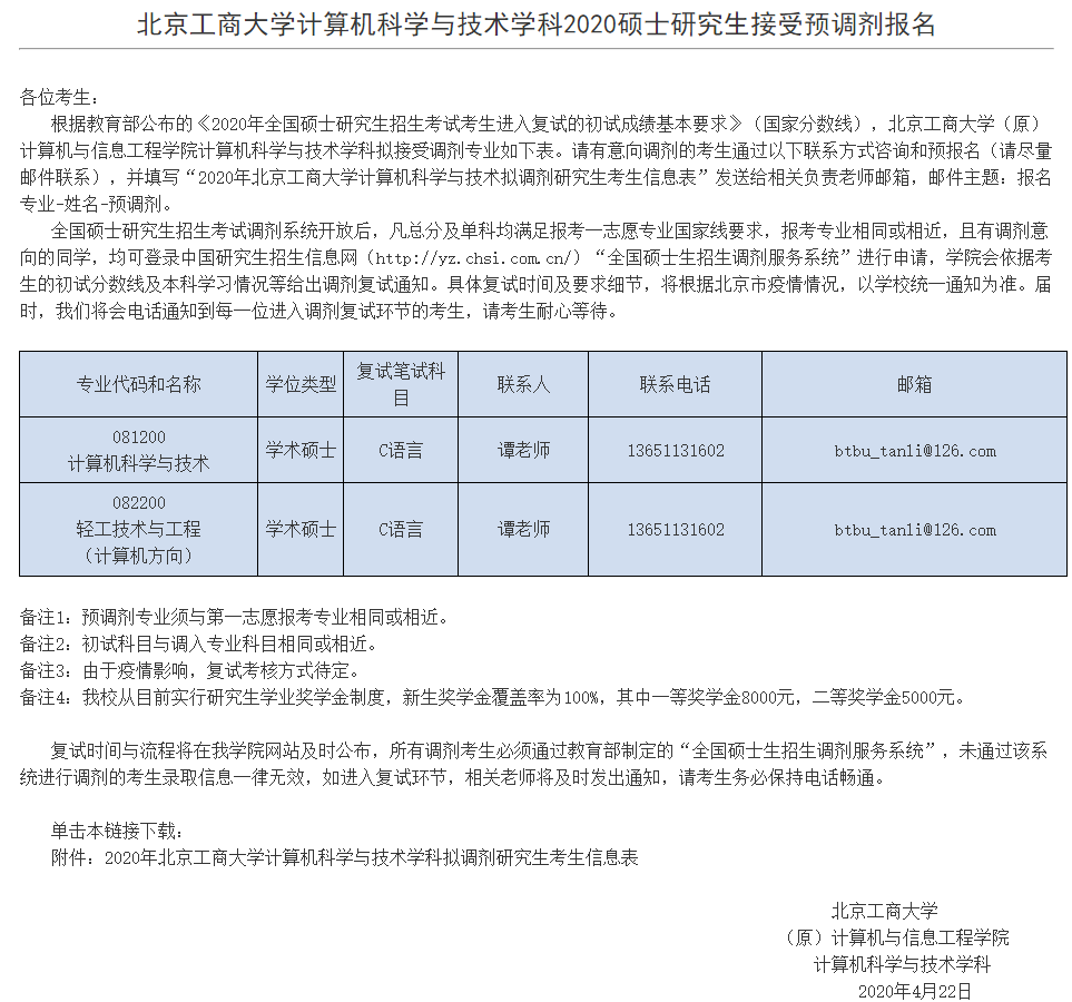 2020拼搏在线官网调剂信息:北京工商拼搏(中国)计算机与信息工程学院2020年硕士研究生招生调剂信息