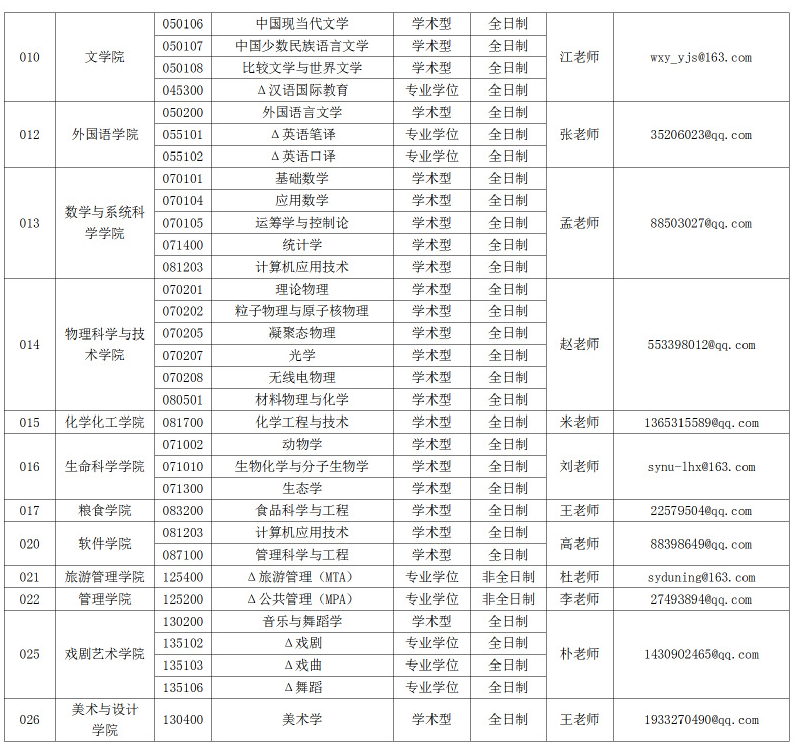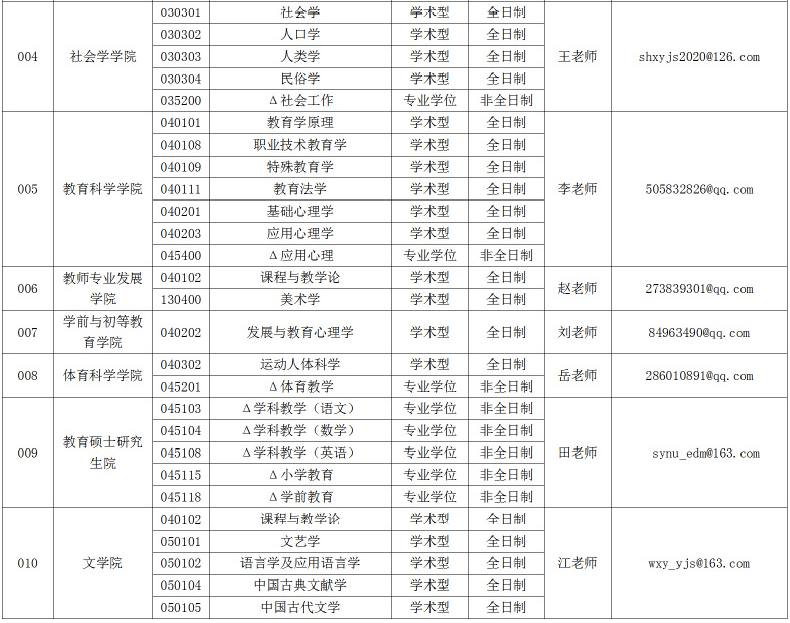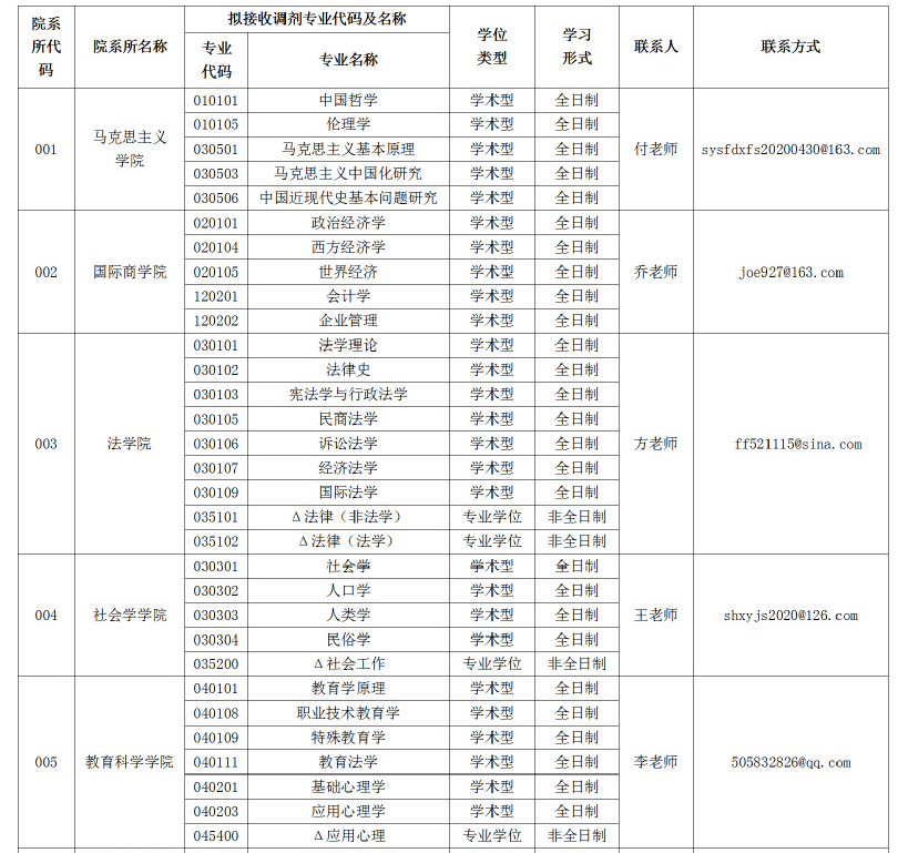 2020年我校拟接收调剂专业及调剂咨询方式详见下表(表中专业名称前带“Δ”为专业学位):