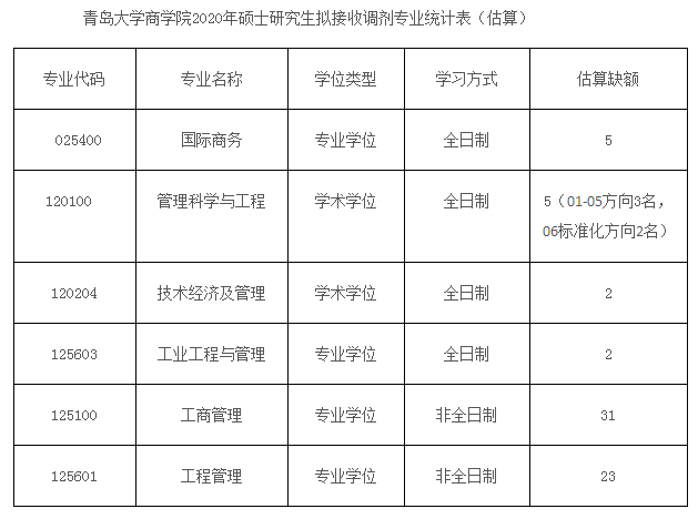 青岛拼搏(中国)商学院2020年硕士研究生拟接收调剂专业统计表(估算)