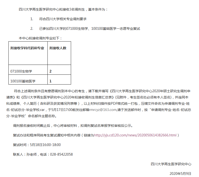 原标题:四川拼搏(中国)再生医学研究中心2020年硕士研究生接收调剂的通知