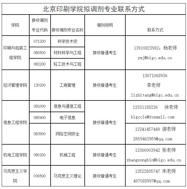 2020年北京印刷学院以下专业拟接收调剂硕士研究生:工商管理(学术硕士)、机械工程(学术硕士)、信息与通信工程(学术硕士)、网络空间安全(学术硕士)、电子与通信工程(专业硕士)、科学技术史(学术硕士)、轻工技术与工程(学术硕士)、材料科学与工程(学术硕士)、马克思主义理论(学术硕士)。从即日起开始接收调剂。调剂考生需满足调入专业与第一志愿报考专业相同或相近,初试科目与调入专业统考科目相同且自命题科目相同或相近。请符合我校调剂政策、有调剂意向的考生,尽快与相关学院联系。