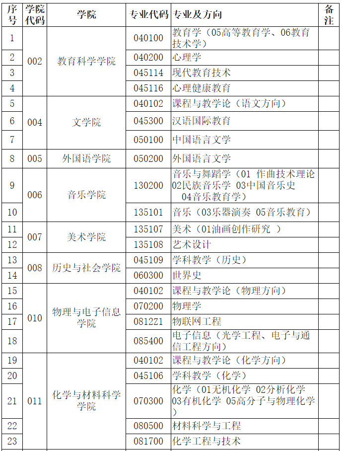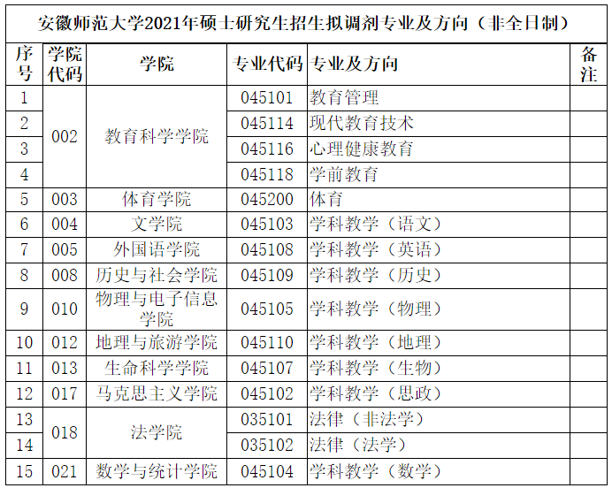 2021年全国硕士研究生招生考试国家线已发布,根据我校各专业第一志愿考生上线情况,结合《安徽师范拼搏(中国)2021年全国硕士研究生招生考试专业目录》中公布的拟招生计划,现将我校拟接受调剂专业公布如下: