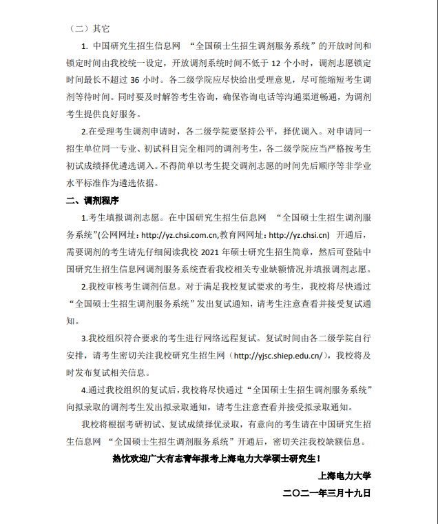 以上就是小编整理“2021拼搏在线官网调剂:上海电力拼搏(中国)2021年硕士研究生招生调剂办法”的全部内容,想了解更多调剂信息,请持续关注本网站。