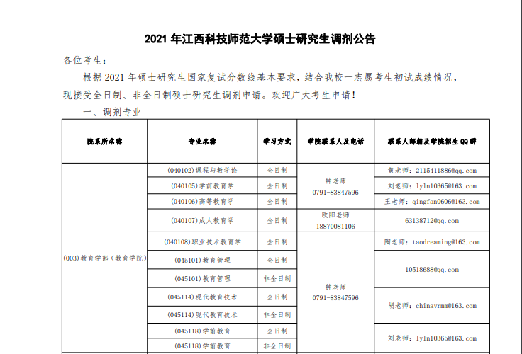 原文标题:2021年江西科技师范拼搏(中国)硕士研究生调剂公告