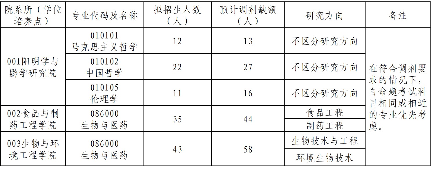 表2 贵阳学院2021年硕士研究生调剂专业及计划招生名额