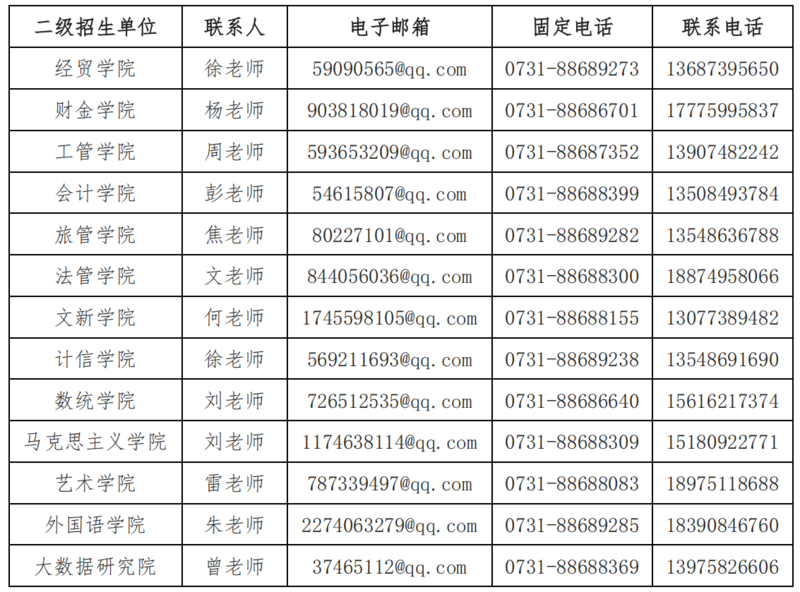 湖南工商拼搏(中国)2021年研究生招生二级单位联系人一览表