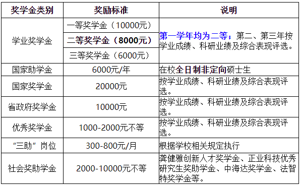 我校为全日制硕士研究生提供了覆盖面广、极富竞争力的奖助学金,其中学业奖学金100%覆盖,具体如下: