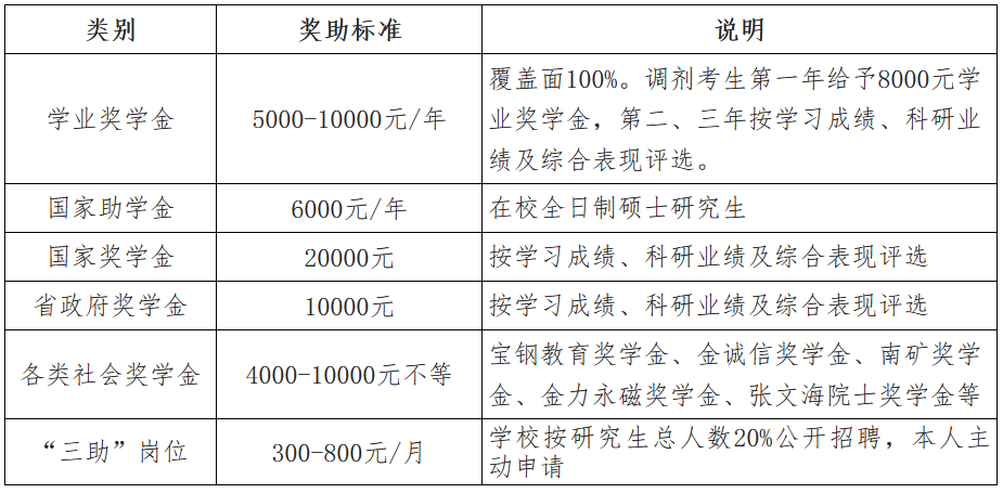 学校设有学业奖学金、国家助学金、国家奖学金、省政府奖学金、各类社会奖学金、研究生“三助”助学金等。非全日制硕士研究生、人事档案未转至我校的全日制硕士研究生不享受奖、助学金。