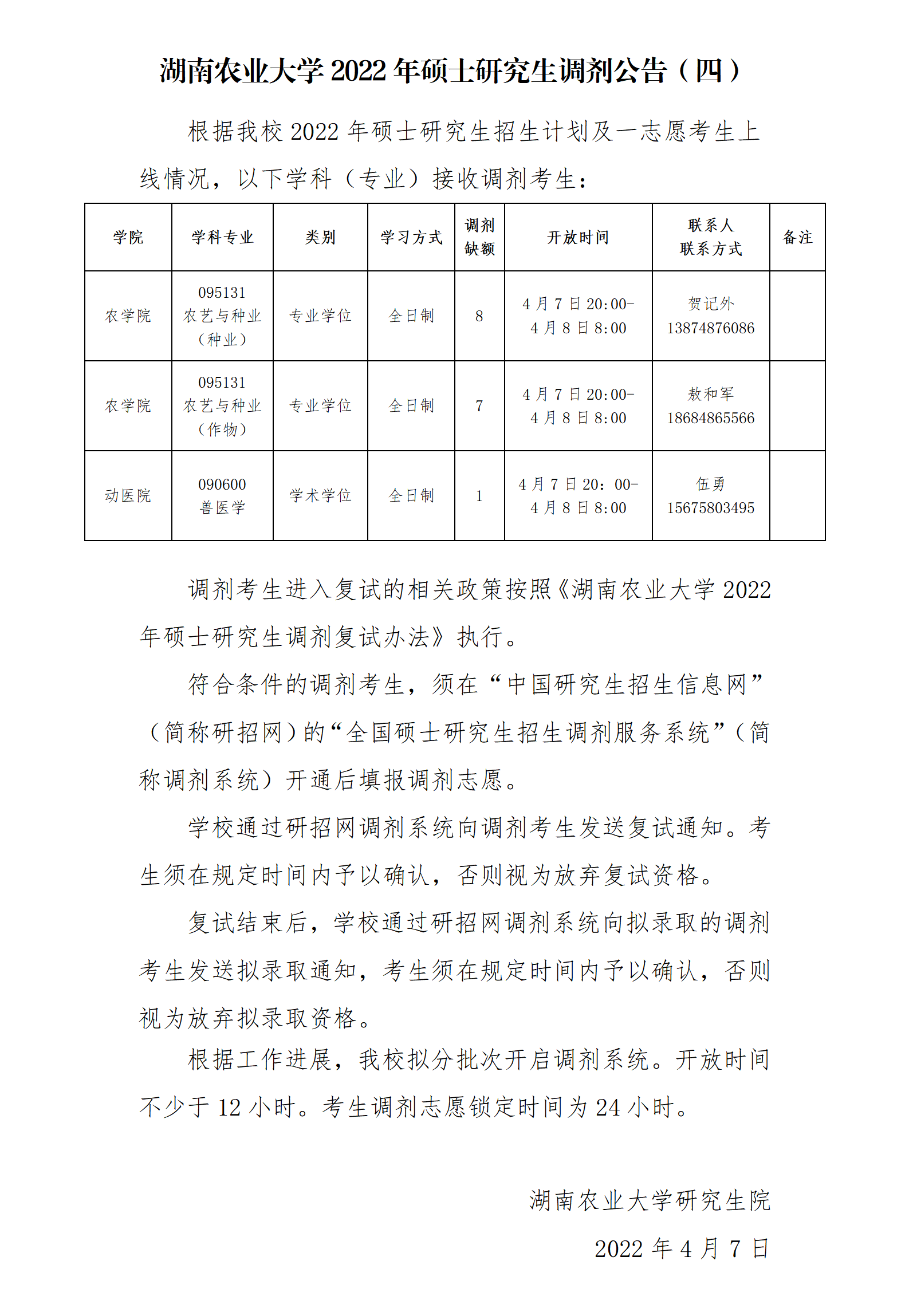以上就是小编整理“2022拼搏在线官网调剂:湖南农业拼搏(中国)2022年硕士研究生调剂公告(四)”的全部内容,想了解更多调剂信息,请持续关注本网站。