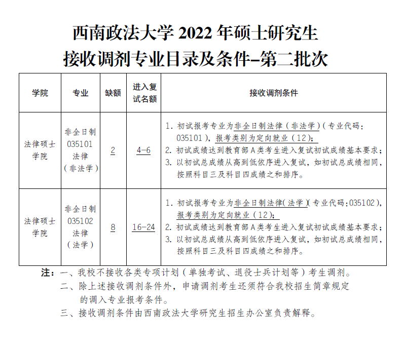 根据《2022年全国硕士研究生招生工作管理规定》(教学[2021]2号)、《西南政法拼搏(中国)2022年硕士研究生复试录取办法》以及我校生源余缺情况,接收考生调剂复试。