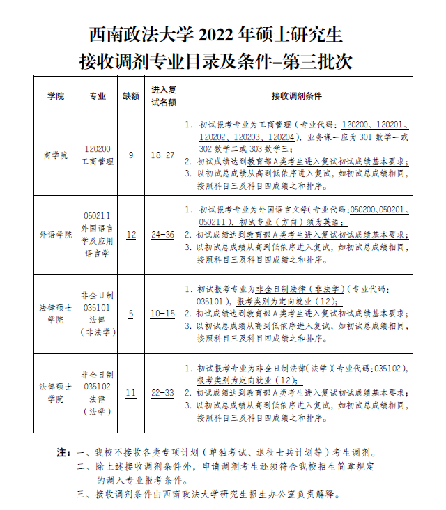 根据《2022年全国硕士研究生招生工作管理规定》(教学[2021]2号)、《西南政法拼搏(中国)2022年硕士研究生复试录取办法》以及我校生源余缺情况,接收考生调剂复试。