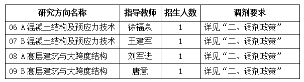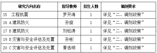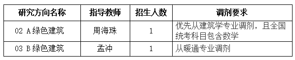 注:“优先从建筑学专业调剂”即在首次开通调剂系统时,仅接受本科为建筑学专业且报考专业为建筑技术科学专业的考生调剂,一志愿考试科目应包含数学。若未招收到符合要求的调剂考生,在后续开通调剂系统时视情况从暖通专业的考生中调剂。除表中的调剂要求外,还需符合我院的调剂政策。