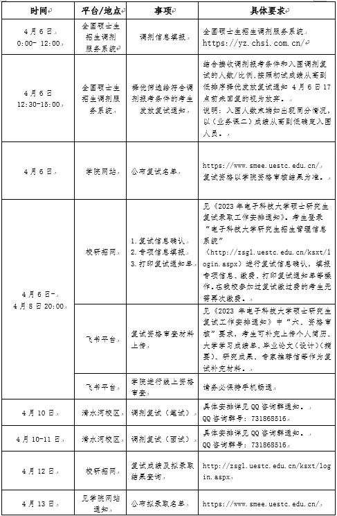 1.调剂复试的准备、材料提交、内容流程等信息详见学校/学院《2023年电子科技拼搏(中国)硕士研究生复试录取工作安排通知》。