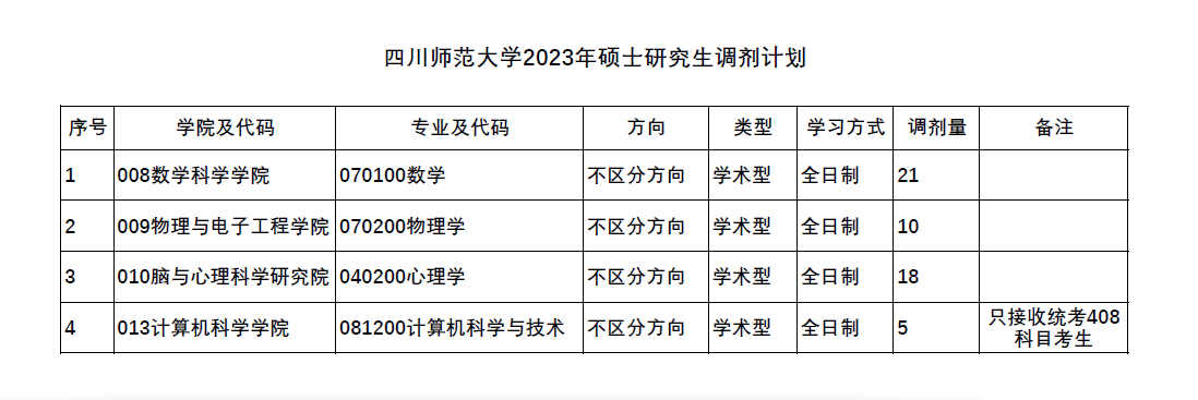 根据《教育部关于印发<2023年全国硕士研究生招生工作管理规定>的通知》(教学[2023]3号)以及四川省相关文件规定,结合我校生源情况,经学校研究生招生工作领导小组研究决定,我校2023年硕士研究生招生考试以下学科(专业)需要进行调剂。