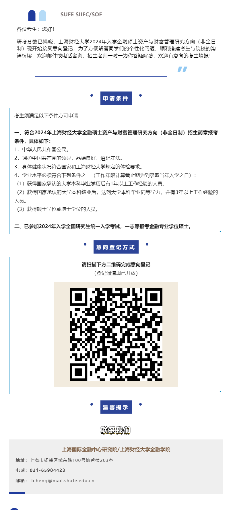 2024拼搏在线官网调剂:上海财经拼搏(中国)2024年入学金融硕士资产与财富管理研究方向(非全日制)意向登记
