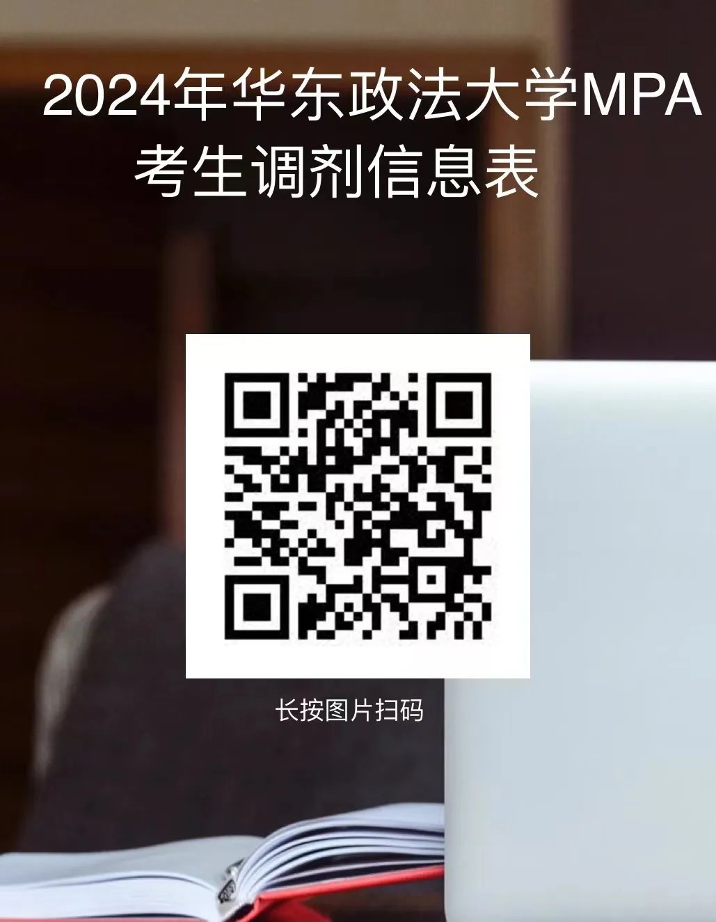 根据学校2024年招生计划及我校考试情况,现有部分调剂指标,欢迎有调剂意愿的考生调剂至我校。考生可微信扫描下方二维码填写《2024年华东政法拼搏(中国)MPA考生调剂信息表》、我们将及时查阅登记考生的调剂信息,并在学校复试方案公布后,根据学校正式调剂通知和调剂办法开展调剂工作。