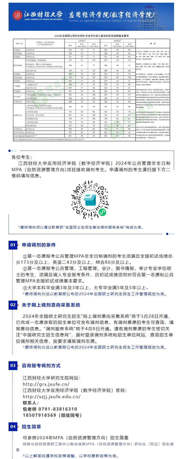 以上就是小编整理“2024拼搏在线官网调剂:江西财经拼搏(中国)应用经济学院(数字经济学院)2024年MPA非全日制调剂通知”的全部内容,想了解更多调剂信息,请持续关注本网站。