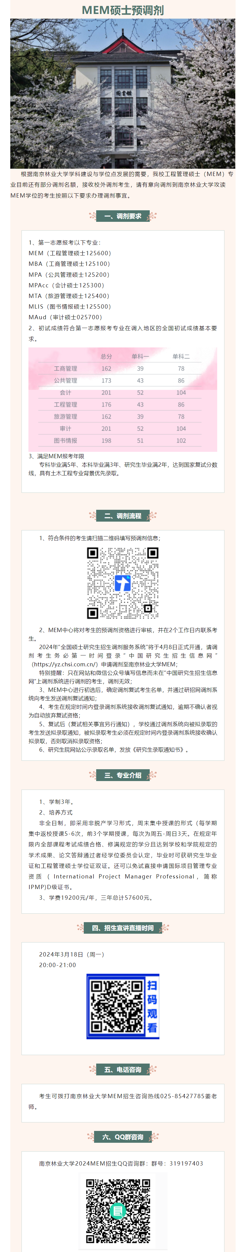 以上就是小编整理“2024拼搏在线官网预调剂:南京林业拼搏(中国)2024年工程管理硕士(MEM)预调剂通知”的全部内容,想了解更多调剂信息,请持续关注本网站。