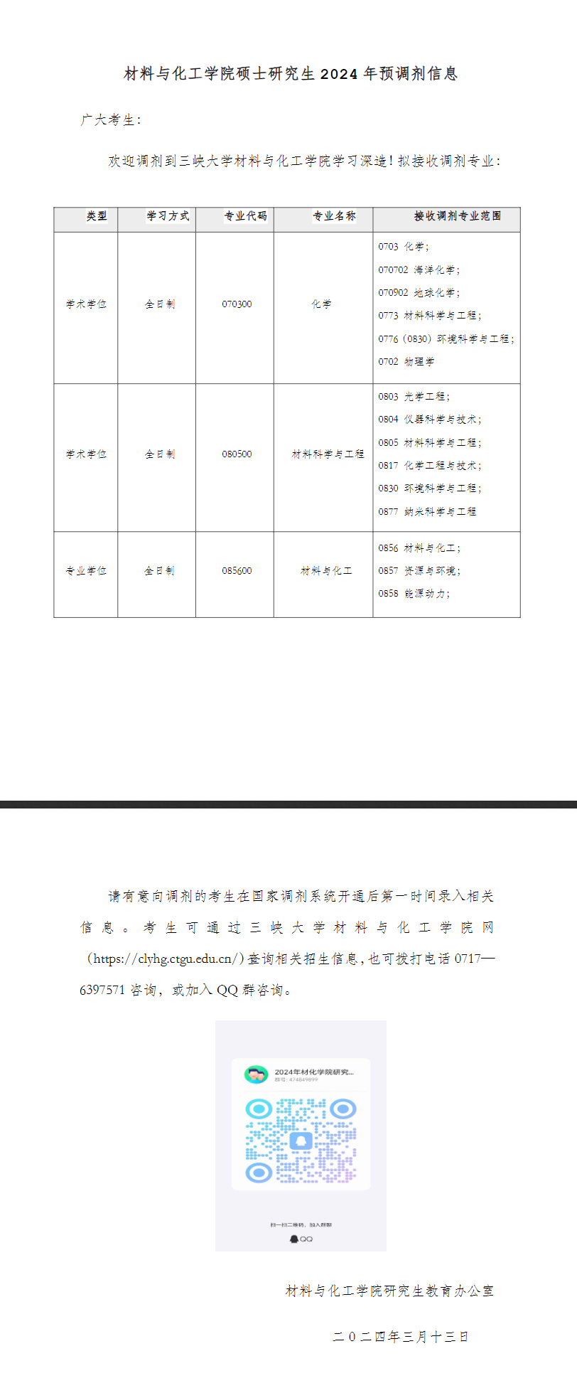 以上就是小编整理“2024拼搏在线官网预调剂:三峡拼搏(中国)材料与化工学院硕士研究生2024年预调剂信息”的全部内容,想了解更多调剂信息,请持续关注本网站。