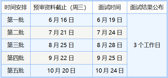 ① 报名表格及申请材料提交时间为每个批次面试前两天截止,否则请参加下次面试。