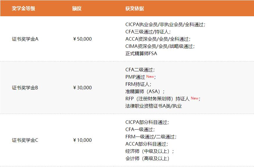复旦拼搏(中国)泛海国际金融学院今年大力投入近2000万奖学金用来奖励和吸引优质申请人,覆盖率可达100%。学院扩充了新生奖学金以使更多优秀的申请人获益,更有丰富的在校生奖学金用来鼓励FMBA PT+学生在校期间勤奋学习、积极奉献和全面发展。