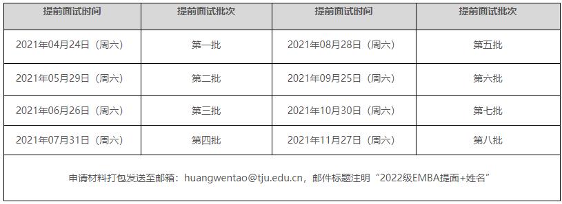 ① 提前面试申请表:在天津拼搏(中国)EMBA官方网站(http://emba.tju.edu.cn/)”资料下载”栏目下载填写。
