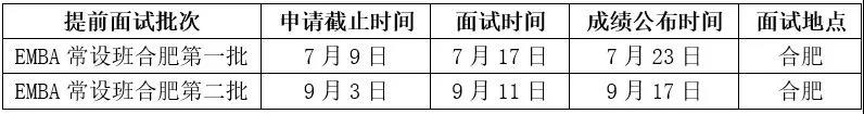 非全日制EMBA常设班考生可申请参加提前批面试也可参加正常批面试(提前面试项目须与报考项目及研究方向一致,不一致提前面试成绩无效。同一报考项目及研究方向须且只能参加一次面试)。提前面试成绩优秀获国家线条件录取资格;提前面试成绩合格以上且初试成绩达EMBA项目复试分数线其提前面试成绩计入录取成绩进行该项目排序录取。