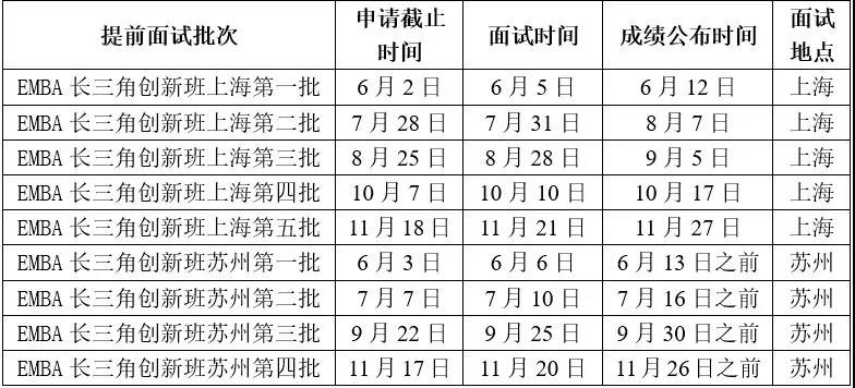 非全日制EMBA长三角创新班考生实行全面提前面试(提前面试项目须与报考项目及研究方向一致,不一致提前面试成绩无效。同一报考项目及研究方向须且只能参加一次面试)。提前面试成绩优秀获国家线条件录取资格;提前面试成绩合格以上且初试成绩达EMBA项目复试分数线其提前面试成绩计入录取成绩进行该项目排序录取。