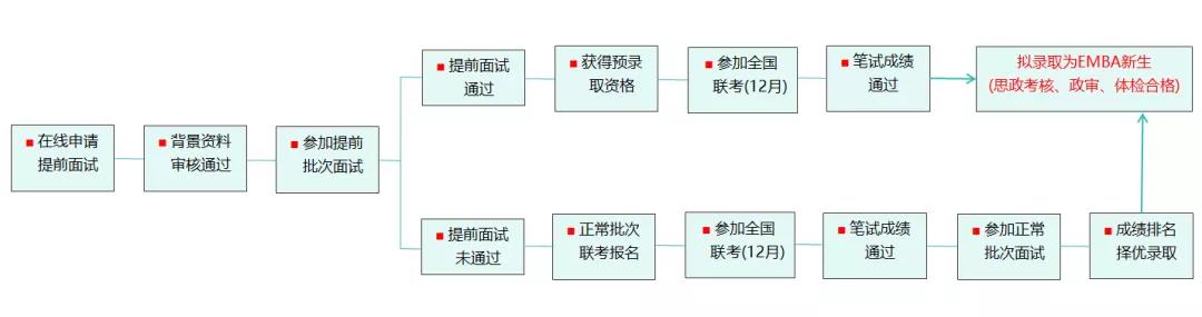 2022年EMBA面试分为提前批面试和正常批面试。通过提前批面试并获得预录取资格的考生,如果联考成绩达到国家A类线,并通过资格审核和思想政治理论考核,即可直接获得拟录取资格。