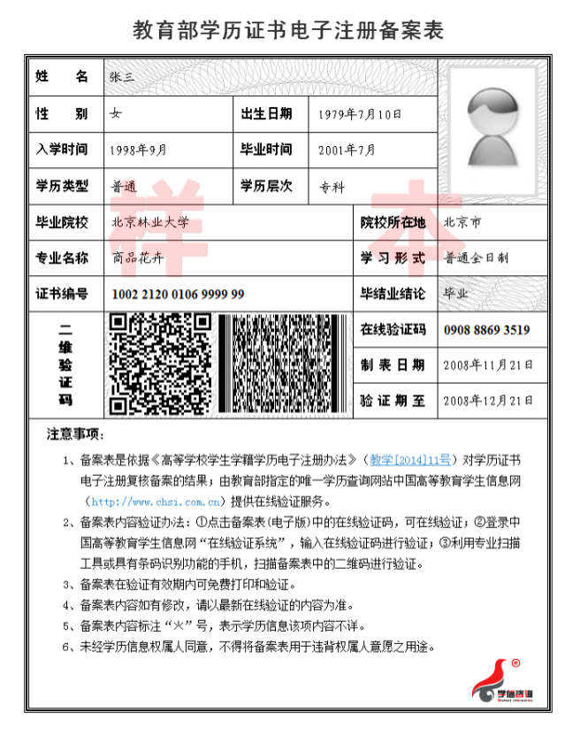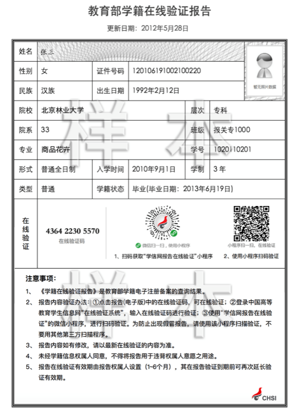 1.在渝高校2021届全日制应届本科毕业考生(含全日制成人高校本科毕业生)中,除上传上述“基本材料”外,还须上传“中国高等教育学生信息网”的《教育部学籍在线验证报告》。样照如下: