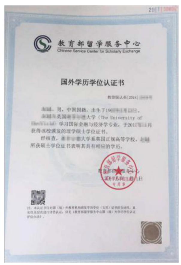 2.在境外获得学历证书的考生,须上传教育部留学服务中心出具的《国外学历学位认证书》。样稿如下: