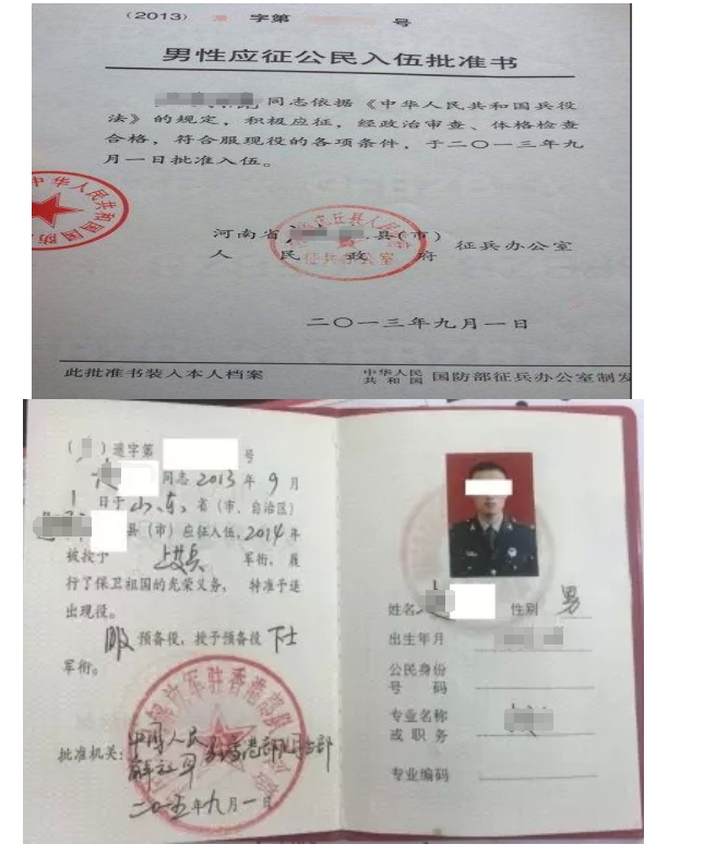 2、《入伍批准书》、《退出现役证》分别上传,请确保证件图像边框完整,亮度均匀,文字正向显示,字迹清晰可见;