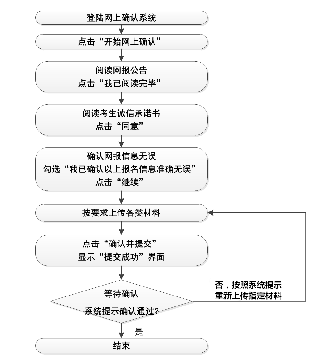 考生须于规定时间通过网上确认平台,完成本人的“核对网报信息、上传本人电子照片、上传身份证及其它相关材料照片”等手续,逾期不再补办。建议考生不要在确认的最后一天提交审核材料,以免因审核不通过没有充足的时间准备补充材料。