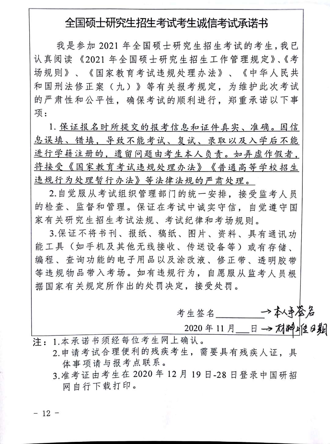 3.准考证打印:考生于2020年12月19日-28日凭网报用户名和密码登陆研招网自行下载打印准考证(使用A4幅面白纸打印,正、反两面在使用期间不得涂改或书写)。
