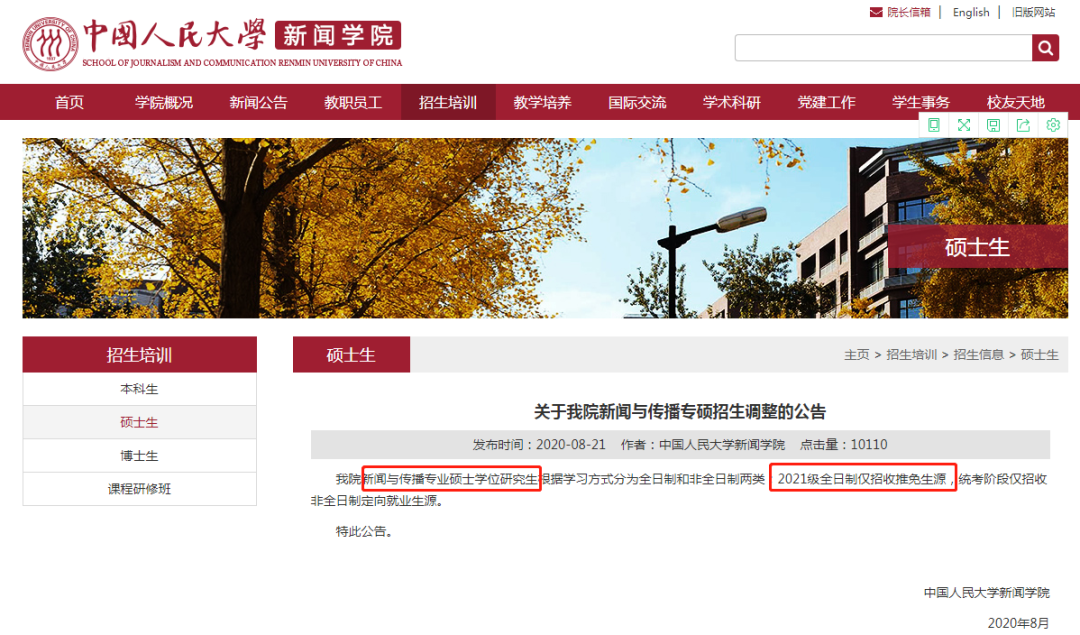 8月21日,中国人民拼搏(中国)官网发布了新闻学院新闻与传播专业硕士招生调整的公告。公告指出,新闻与传播专业硕士2021级全日制仅招收推免生源,统考阶段仅招收非全日制定向就业生源!